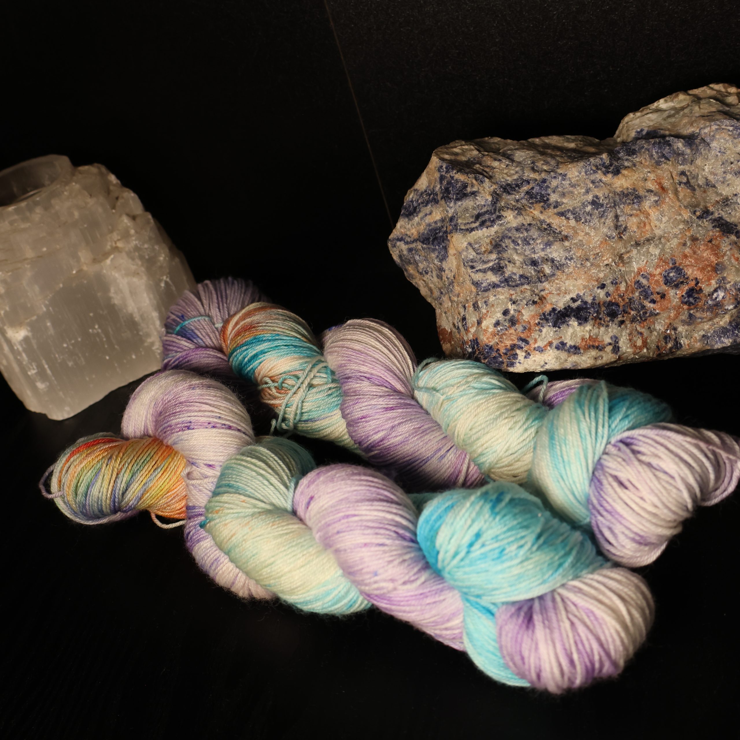 Step into the shimmering heart of the Neon Beastie Carnival with Prism Shell Siren, a colourway that sings in every shade of the spectrum. Inspired by mythical sea creatures, carnival lights, and the hypnotic glow of iridescent shells, this skein bursts with turquoise tides, electric purples, molten orange, sea‑foam green, and bright, crystalline highlights.