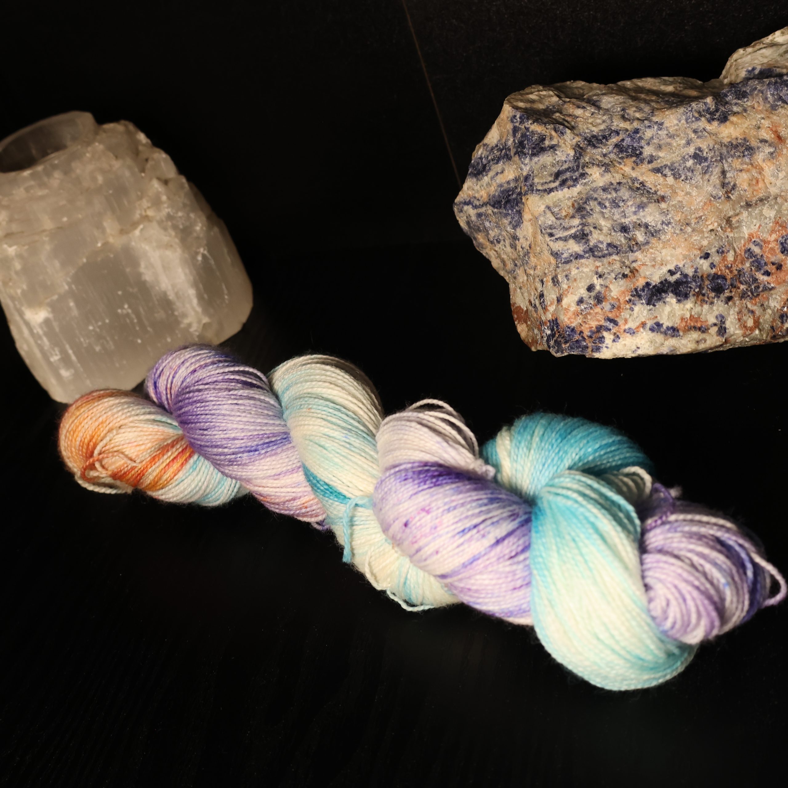 Step into the shimmering heart of the Neon Beastie Carnival with Prism Shell Siren, a colourway that sings in every shade of the spectrum. Inspired by mythical sea creatures, carnival lights, and the hypnotic glow of iridescent shells, this skein bursts with turquoise tides, electric purples, molten orange, sea‑foam green, and bright, crystalline highlights.