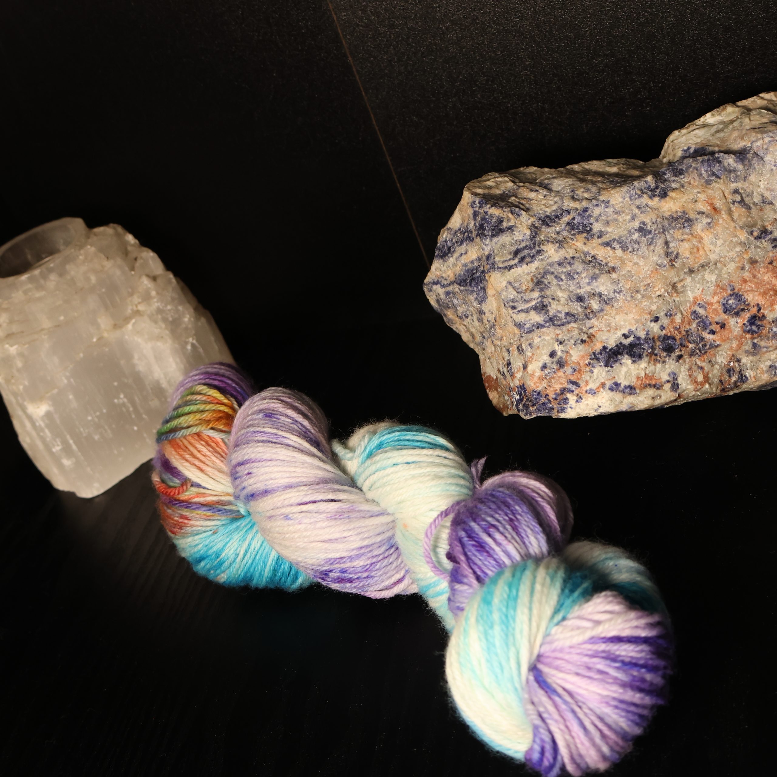 Step into the shimmering heart of the Neon Beastie Carnival with Prism Shell Siren, a colourway that sings in every shade of the spectrum. Inspired by mythical sea creatures, carnival lights, and the hypnotic glow of iridescent shells, this skein bursts with turquoise tides, electric purples, molten orange, sea‑foam green, and bright, crystalline highlights.