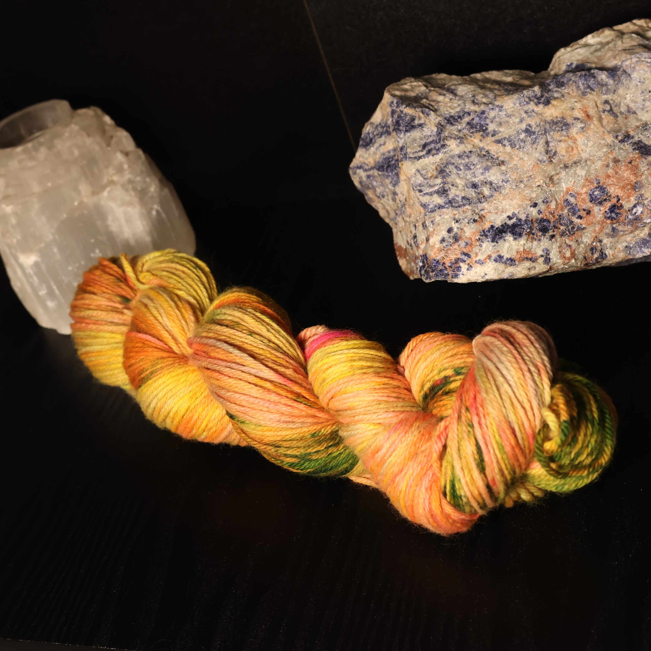Swirls of hot pink, citrus yellow, lime green, and electric orange twist together like enchanted noodles caught in a dragon’s tail. Pops of bright colour dance across the skein, creating a palette that’s playful, fiery, and full of movement — perfect for makers who love yarn with personality.