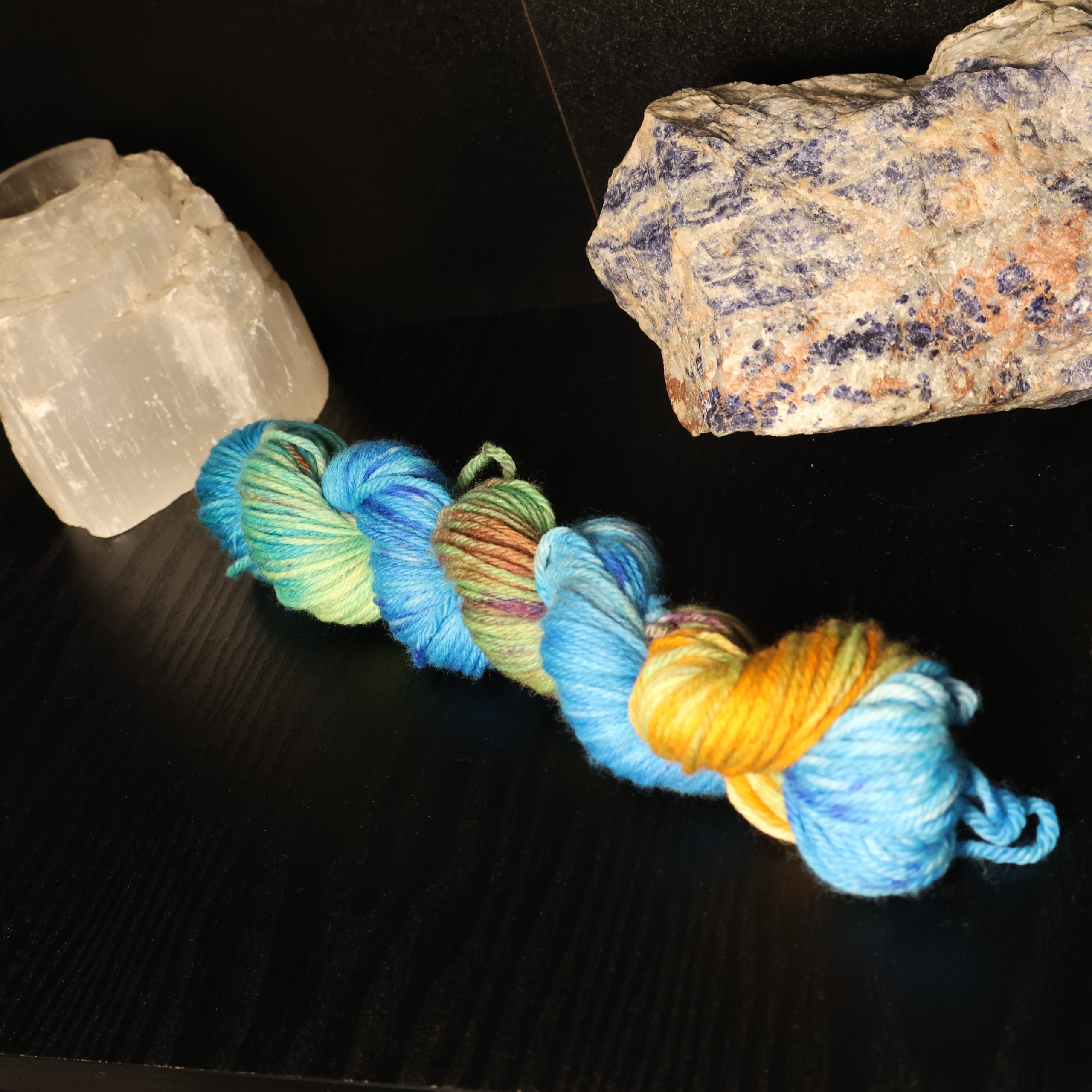 Unleash the sweetest kind of chaos with Jellybean Kraken, a wild and joyful colourway from the Neon Beastie Carnival Collection. This skein bursts with the energy of a mythical sea monster who’s raided a pick‑and‑mix stand — swirling blues, electric greens, sunny yellows, and juicy pops of red and purple collide in a riot of carnival colour.